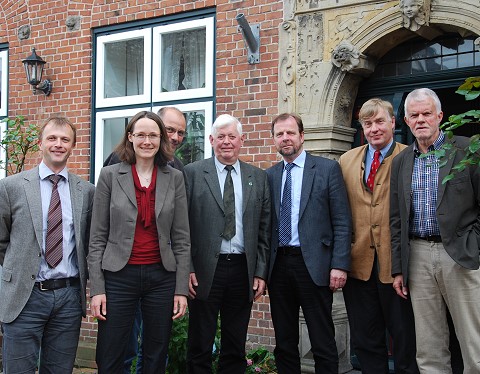 Staatssekretärin Dr. Ingrid Nestle und Dietmar Wienholdt vom Ministerium für Energiewende, Landwirtschaft, Umwelt und ländliche Räume (5.v.li.) trafen sich in Wöhrden mit Vertretern des Marschenverbandes (v. li.): Matthias Reimers, Jan Albrecht, Heinrich Marx, Udo Prinz von Schoenaich-Carolath-Schilden, Hans-Rudolf Heinsohn. Nicht auf dem Foto: Hans Hermann Magens. (Foto: Kienitz)